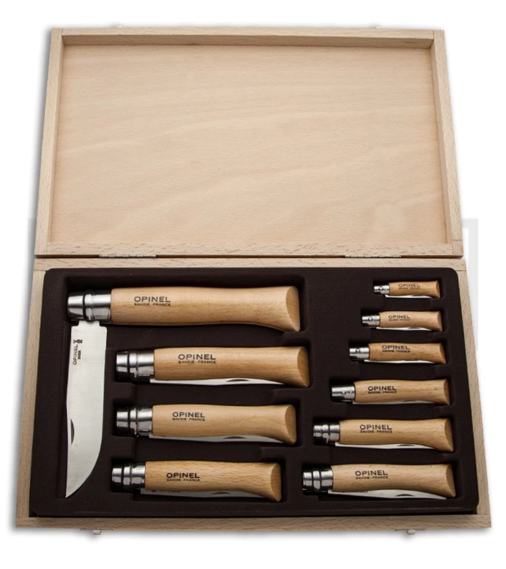 This Opinel collection knife set comes with 10 folding knives (No 2 through No 12) in an elegant wooden gift box. Each folder features a 12C27 Sandvik stainless steel blade, beechwood handle, and the Viroblock safety lock.